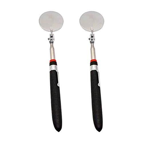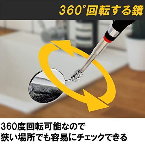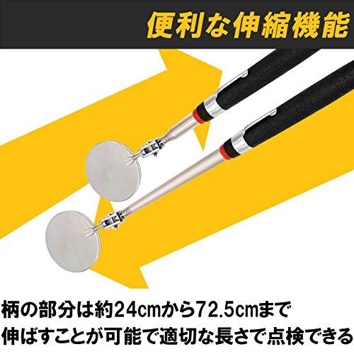 丸型ミラーの付いた検査鏡の2本セット:施工業者などが現場で使う検査鏡の2本セットです。狭いところや手の届かないところなど、直接見られない場所を鏡に映すことによりチェックすることができます。2本セットでプロの現場におすすめです。鏡部分は回転、柄の部分は伸縮するので便利:先端に付いている鏡部分は回転、柄の部分は約24cmから72.5cmまで伸ばすことが可能ですので、見にくい場所でもチェックすることが可能。効率的に検査作業を行うことができます。グリップが握りやすい:グリップ部分が滑りにくく、握りやすくなっているのも特徴です。また、グリップ部分にはペンフックが付いていますので、作業していない時にはポケットなどに留めておくことができます。施工業者だけでなく、機械を扱う現場でも便利:検査鏡は施工業者だけでなく、さまざまな職業の現場で使えます。自動車整備でのエンジン回りのチェック、コピー機や大型コンピュータの修理などにも役立ちます。家庭にも1本常備しておくと高い場所の点検などの際に活躍してくれます。セット内:2個セット カラー:シルバー×ブラック ※モニターの環境等により、色の見え方に若干差が生じる場合がございます。
