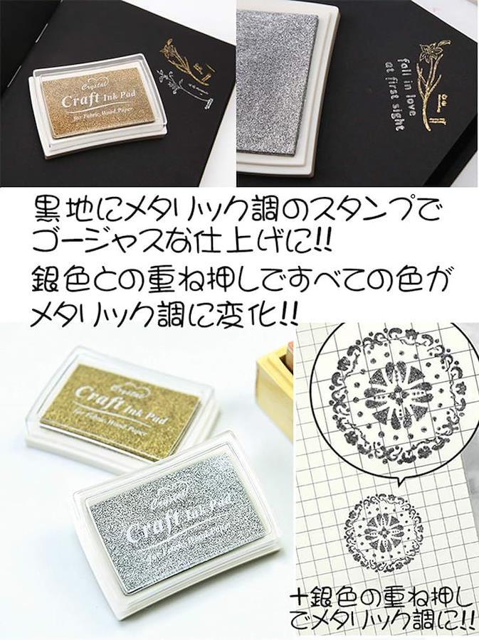 基本的な色からメタリック調に色を変化させることが出来る、銀色・金色まで断然スタンプを押すのが楽しくなります。