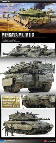 近未来的なスタイルが特徴の、イスラエル国防軍メルカバMk.IV戦車。市街戦を想定した装備を施したLICタイプです。車体下部や砲塔に追加装甲を装備。砲塔や車体上部の滑り止めもモールドで再現しました。イスラエル国防軍の戦車兵、歩兵各1体が付いています。