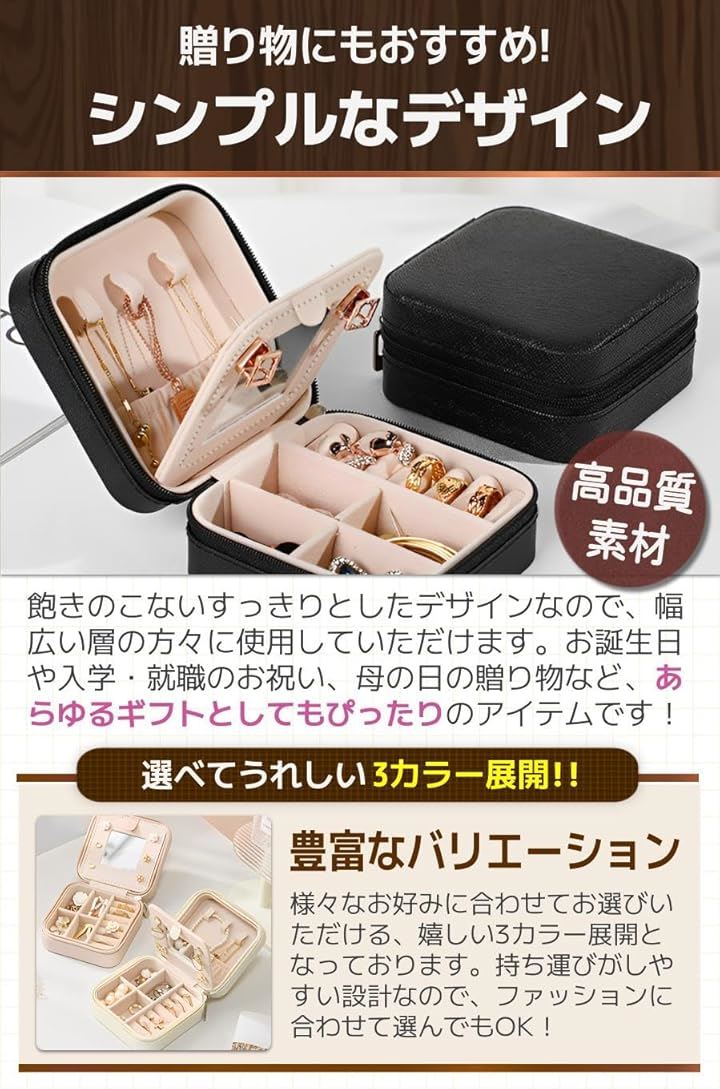 「商品特徴」(1)高品質PUレザー製:重厚感たっぷりのPUレザーで高級感を演出/(2)便利なミラー付き:ジュエリーの装着やメイク直しに。/(3)ファスナータイプ:中のジュエリーが滑り落ちる心配なし。/(4)仕切りは取り外しOK:収納方法に合わせて柔軟に対応。