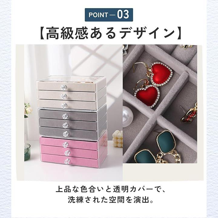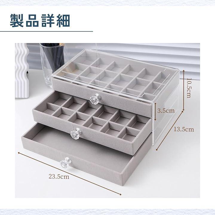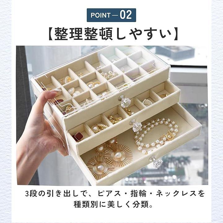 「整理整頓しやすい」3段の引き出しで、ピアス・指輪・ネックレスを種類別に美しく分類。