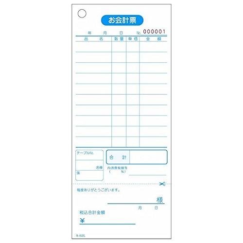 食堂・寿司・スナック等におすすめの御会計票です。連番で番号が入っております。商品名:業務用 お会計表(会計伝票) 既製品/品番:S-02L仕様:10行、穴あけ1ヶ所、単式伝票、領収書付(ミシン目入)、番号入(No.1~10000)/刷色:アイサイズ:75×177mm/入数:100枚×100冊(10000枚)メーカー名:大黒工業株式会社