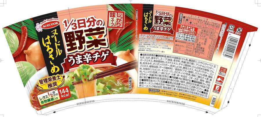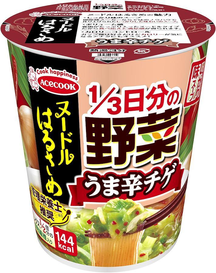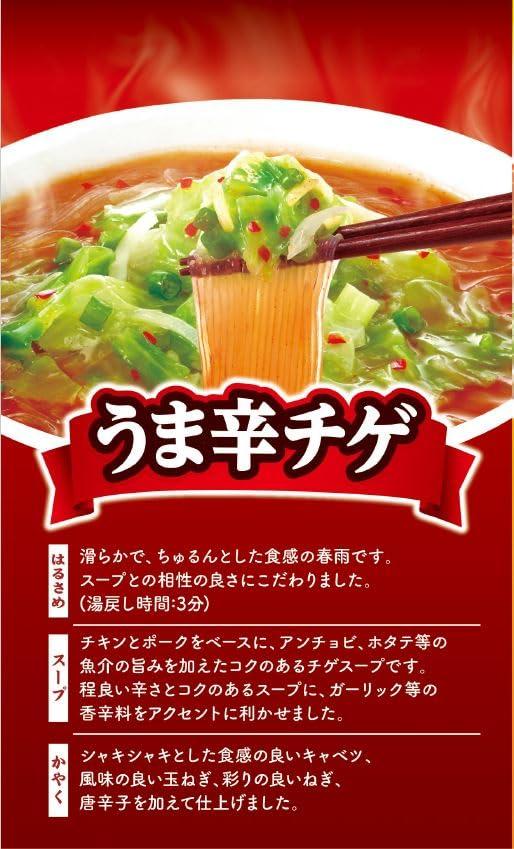 「ヌードルはるさめ」シリーズは、はるさめとたっぷりの野菜だから、1食食べても100kcal台なのにめんを食べている充実感と1/3日分の野菜が食べられる満足感を同時に感じられる一食完結型カップはるさめです。美味しさやボリュームは妥協したくないけれども、体も気づかいたい方にぴったりです。「ヌードルはるさめ うま辛チゲ」はるさめはスープとの相性にこだわり、滑らかでちゅるんとした食感に仕上げました。スープは、鶏・豚をベースにアンチョビ・ホタテ等の魚介の旨みを加えた、コクのあるチゲスープです。ガーリック等の香辛料を加える事で、コクと程よい辛さに仕上げました。具はキャベツ・玉ねぎ・ねぎに唐辛子を加えたたっぷり野菜で、しっかりとした食べ応えが楽しめます。●使用上の注意:やけどにご注意ください。