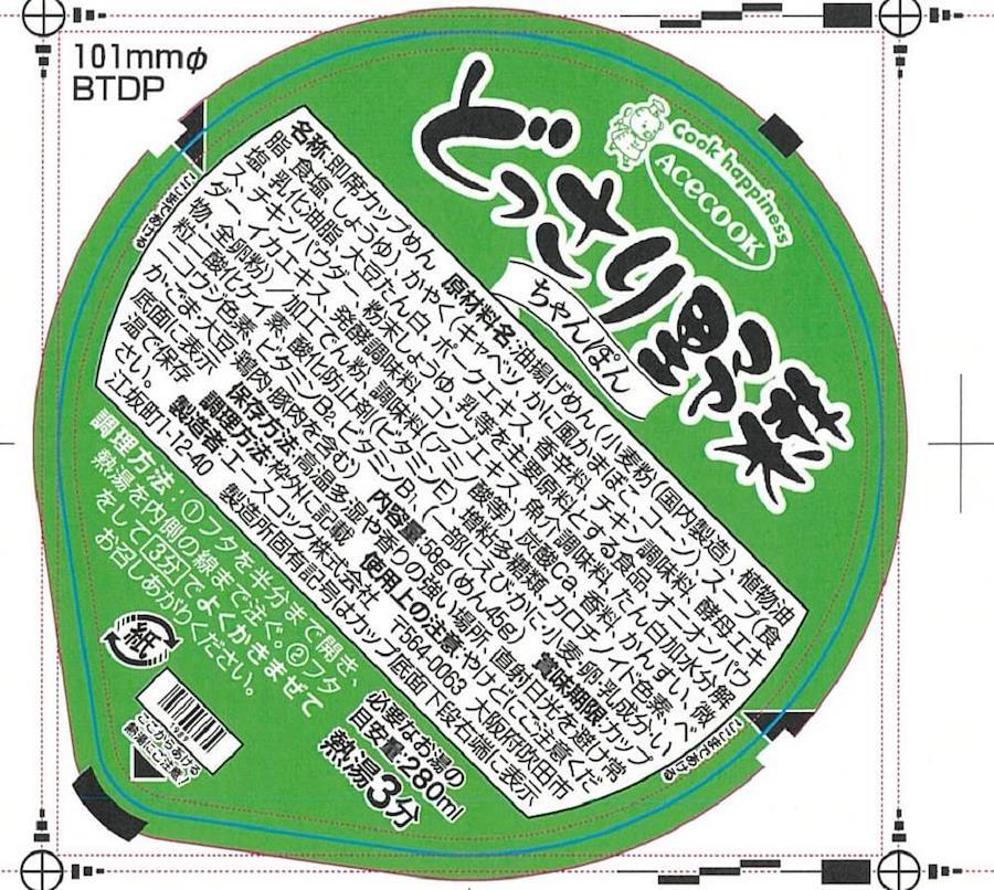 油揚げめん(小麦粉(国内製造)、植物油脂、食塩、しょうゆ)、かやく(キャベツ、かに風かまぼこ、コーン)、スープ(食塩、乳化油脂、大豆たん白、ポークエキス、香辛料、チキン調味料、酵母エキス、チキンパウダー、粉末しょうゆ、乳等を主要原料とする食品、オニオンパウダー、イカエキス、発酵調味料、コンブエキス、魚介調味料、たん白加水分解物、全卵粉)/加工でん粉、調味料(アミノ酸等)、炭酸Ca、香料、かんすい、微粒二酸化ケイ素、酸化防止剤(ビタミンE)、増粘多糖類、カロチノイド色素、ベニコウジ色素、ビタミンB2、ビタミンB1、(一部にえび・かに・小麦・卵・乳成分・いか・ごま・大豆・鶏肉・豚肉を含む)