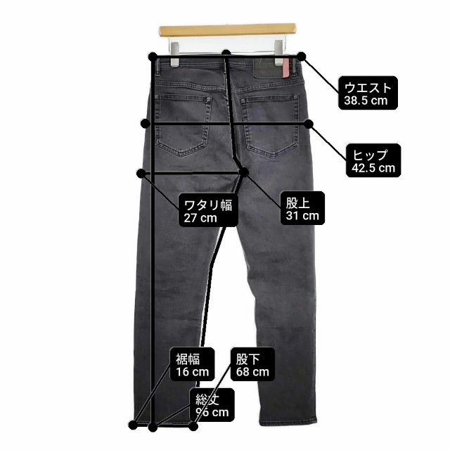 | 実寸サイズ | 総丈:約96cm ウエスト:約38.5cm 股上:約31cm 股下:約68cm ヒップ:約42.5cm ワタリ幅:約27cm 裾幅:約16cm ※採寸画像がある商品はハンガーに吊るした状態での計測のため、平置きでの採寸とは差が生じる場合がございます。平置きでの実寸サイズをご希望の場合は、ご購入前に必ずご質問ください。 ※記載以外のサイズが合わないことを理由とした返品はできませんので、 記載部分以外で実寸サイズの気になる箇所があれば必ず購入前にご質問ください。 |