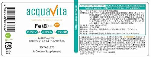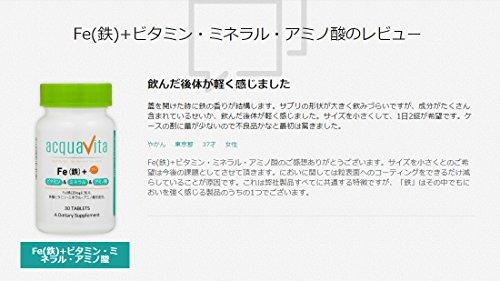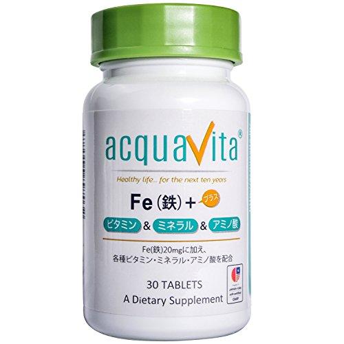 ●開封後はフタをしっかりと閉め、お早めにお召し上がりください。●原材料をご確認の上、食品アレルギーのある方はお召し上がりにならないでください。●疾病などで治療中の方や、妊娠・授乳中の方がご使用になる場合は、事前に医師や薬剤師の方にご相談ください。「acquavita(アクアヴィータ) Fe(鉄)+ビタミン・ミネラル・アミノ酸」は1粒に鉄を20mg配合。さらに吸収を高めるため各種ビタミン、ミネラル、アミノ酸をバランスよく配合しました。1日1粒目安。 商品サイズ (幅×奥行×高さ) :49×49×92mm 原産国:日本 内容量:10.5g(0.35g×30粒) カロリー:栄養成分表示 1粒(0.35g)あたり エネルギー0.9kcal、たんぱく質0.07g、脂質0.01g、炭水化物0.06g、ナトリウム0.5mg/ビタミンC60mg、ビタミンE6.7mg、ビタミンB 1(2mg)、ビタミンB 2(3mg)、ナイアシン10mg、パントテン酸10mg、ビタミンB6(2mg)、ビタミンB12(18μg)、葉酸40μg、銅1mg、鉄20mg、モリブデン30μg、ラクトフェリン5mg、グリシン60mg