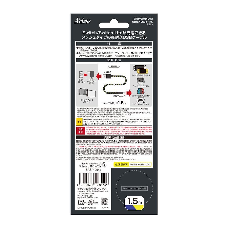 ■セット内容:スプラッシュUSBケーブル×1 ■端子形状:USB-A⇔USB Type-C ■データ通信対応 ■ケーブル長:約1.5m ■対応機種:Switch/SwitchLite/Proコントローラー/Joy-Con充電グリップ/PS5コントローラー本体/その他Type-C充電対応機器