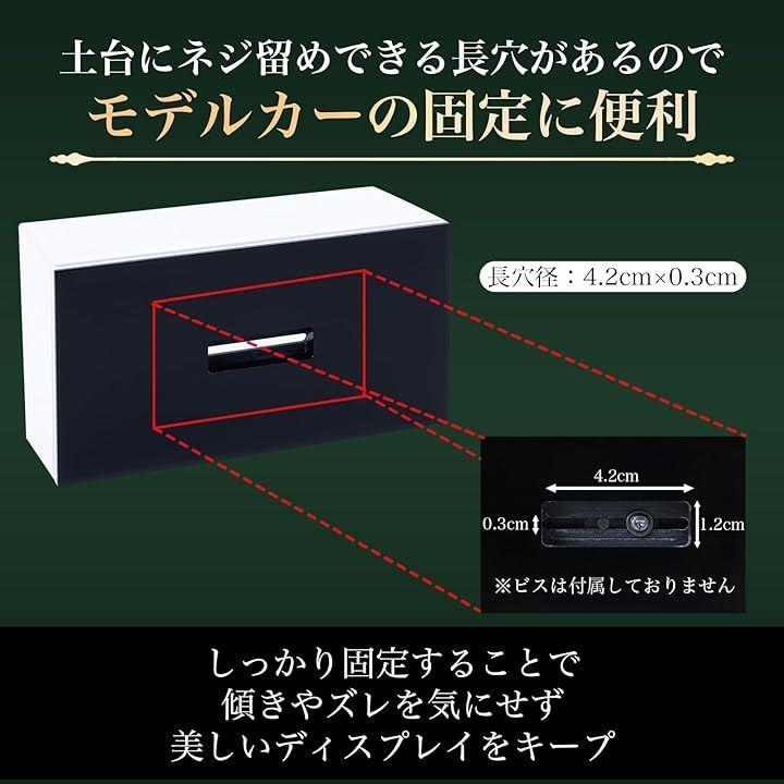 ・ ミニカーをしっかり固定できる設計 台座には固定用の長穴を設け、展示物をビス止めにより安定してディスプレイ可能。