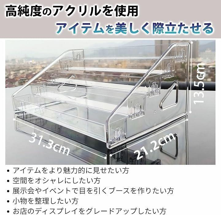 素材: 高透明度のアクリル素材を使用し、展示アイテムを美しく魅せる。