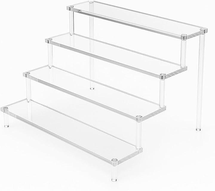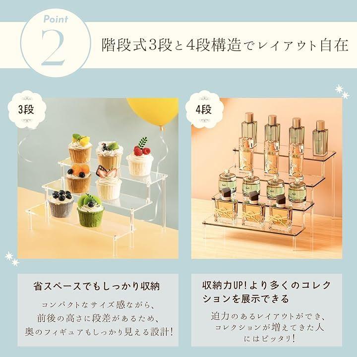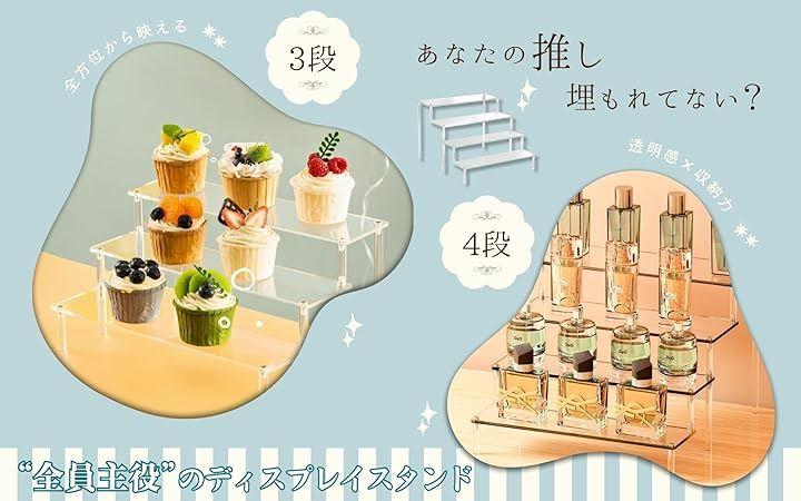 「透明感が際立つアクリルスタンド」 フィギュアや小物を美しく引き立てる、階段状のクリアアクリルスタンドです。