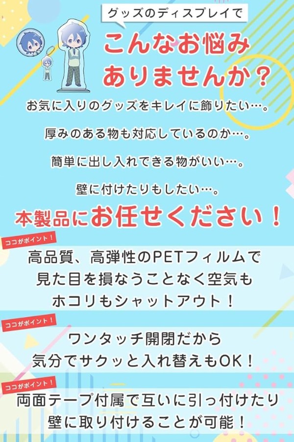 「推しグッズをもっとかわいくディスプレイ。」缶バッジもアクスタもフィギュアもこれに入れれば一気に映え空間。破れにくい高品質、高弾性のPETフィルムで見た目を損なうこともありません。そのまま飾っても壁に貼ってもかわいい、推し活空間づくりの強い味方です。