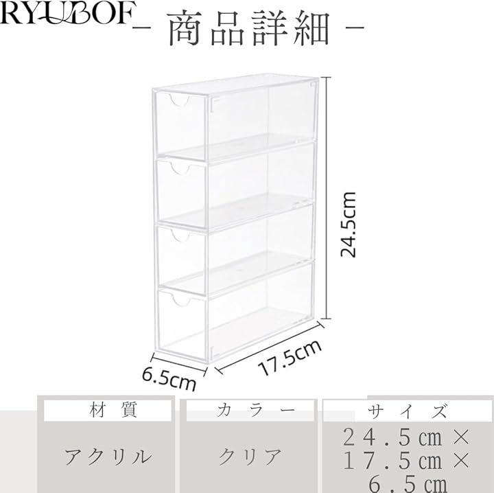 「高透明アクリル素材」耐久性と美観を兼ね備えた透明度の高いアクリルを採用し、収納物の状態が一目で確認できます。