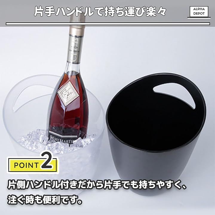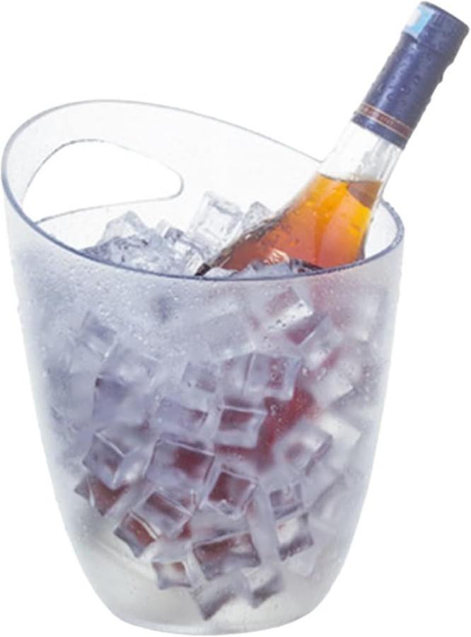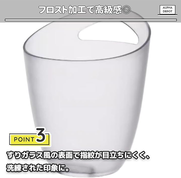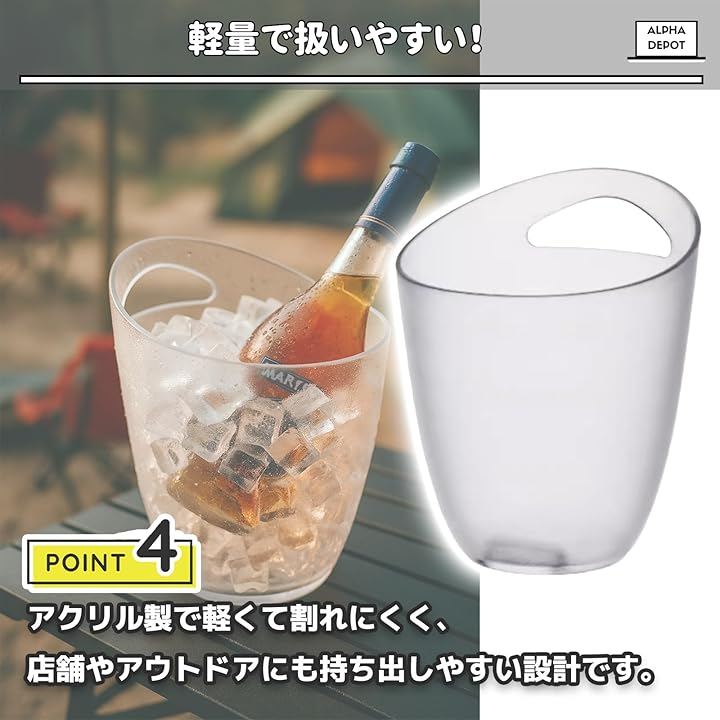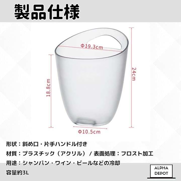 「製品仕様」形状:斜め口・片手ハンドル付き・材質:プラスチック(アクリル)・表面処理:フロスト加工・用途:シャンパン・ワイン・ビールなどの冷却/サイズ:上部直径約19.3cmx底面直径約10.5cmx高さ約24cm(容量約3L)