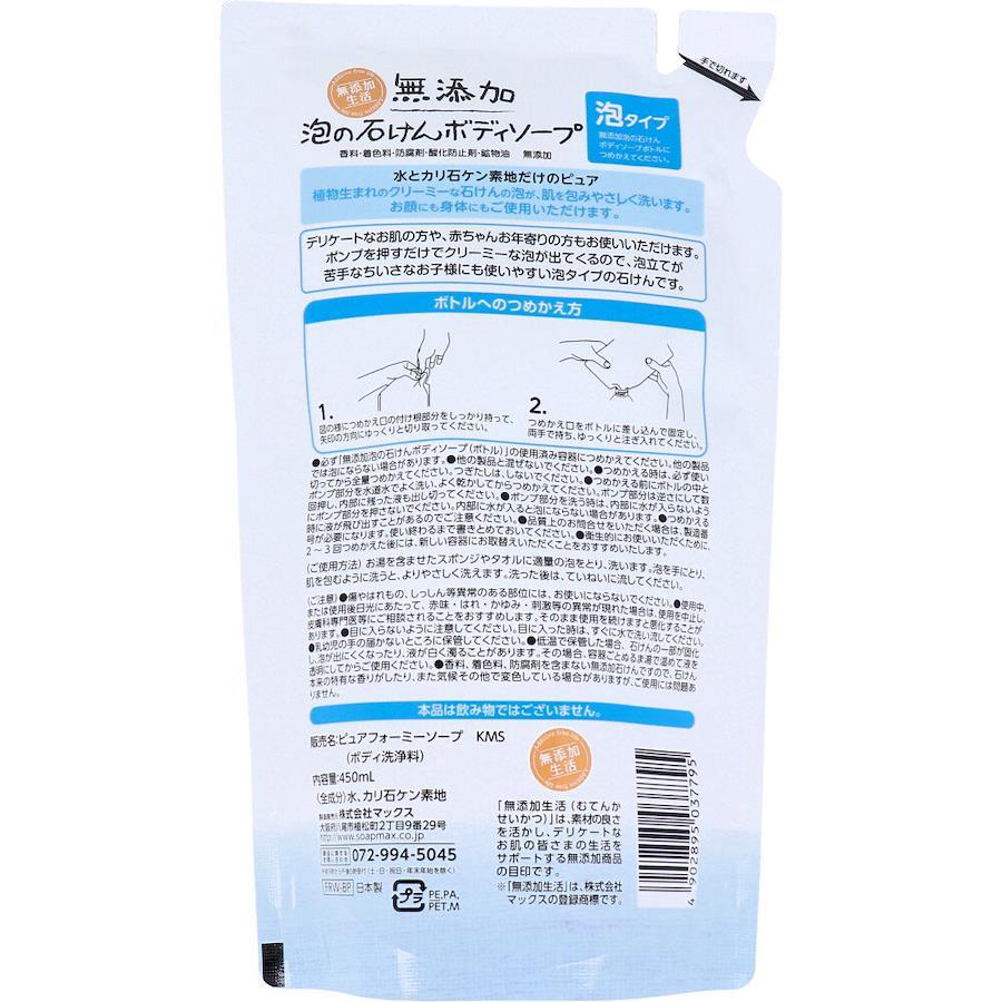 【つめかえ方】(1)つめかえ口の付け根部分をしっかり持って、矢印の方向にゆっくりと切り取ってください。(2)つめかえ口をボトルに差し込んで固定し、両手で持ち、ゆっくりと注ぎ入れてください。・必ず「無添加泡の石けんボディソープ(ボトル)」の使用済み容器につめかえてください。他の製品では泡にならない場合があります。・他の製品と混ぜないでください。・つめかえる時は、必ず使い切ってから全量つめかえてください。つぎたしは、しないでください。・つめかえる前にボトルの中とポンプ部分を水道水でよく洗い、よく乾かしてからつめかえてください。ポンプ部分は逆さにして数回押し、内部に残った液も出し切ってください。・ポンプ部分を洗うときは、内部に水が入らないようにポンプ部分を押さないでください。内部に水が入ると泡にならない場合があります。・つめかえる時に液が飛び出すことがあるのでご注意ください。・ 品質上のお問合せをいただく場合は、製造番号が必要になります。使い終わるまで書きとめておいてください。衛生的にお使いいただくために、2~3回つめかえた後には、新しい容器にお取り替えいただくことをおすすめいたします。