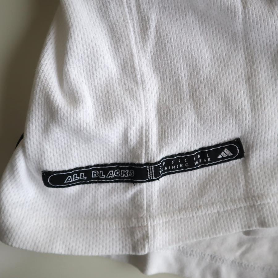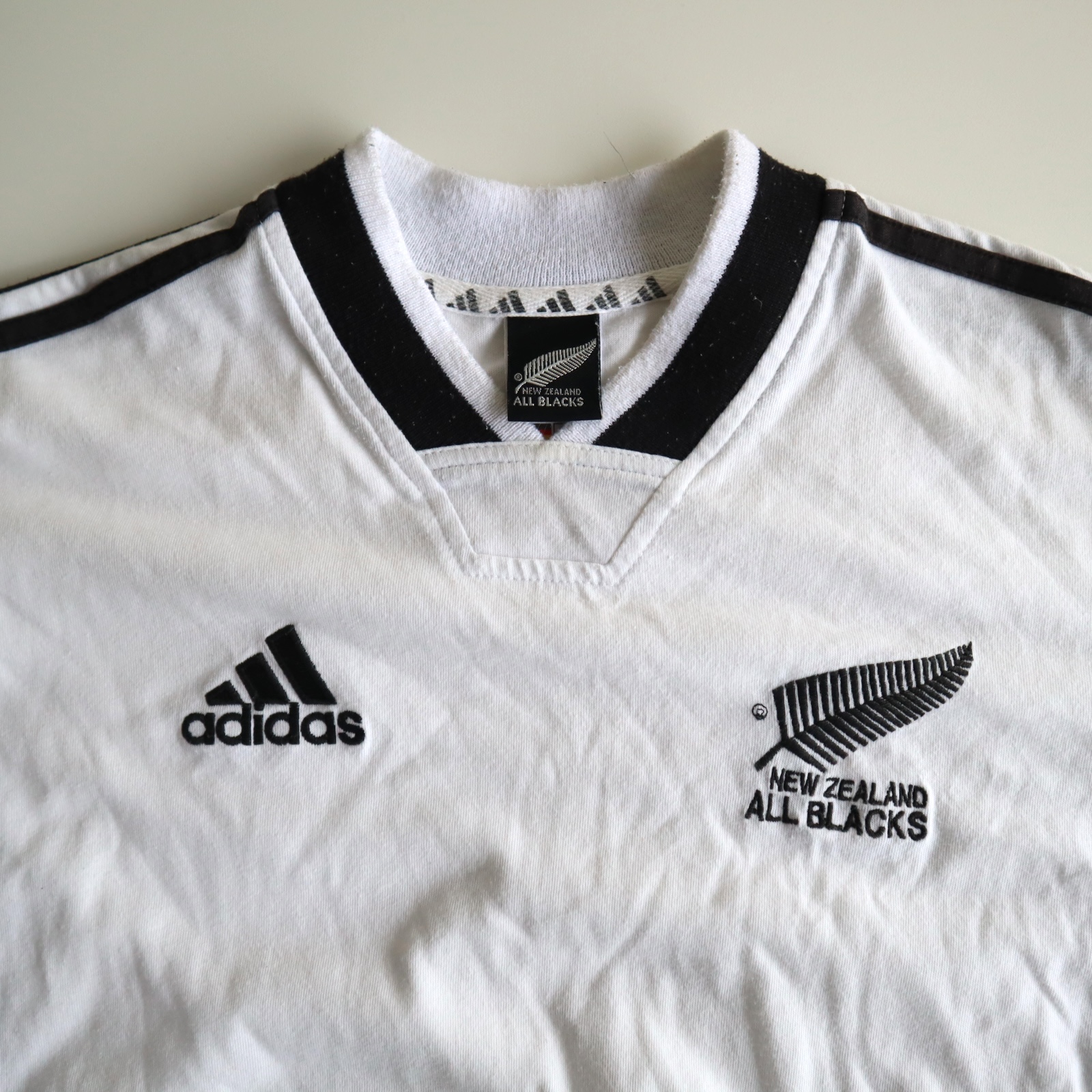 胸元にadidasロゴとオールブラックスの刺繍入り。クラシックなホワイト×ブラックのツートーンデザインが魅力です。スポーツウェアとしてはもちろん、ストリートや古着コーデにもおすすめ。