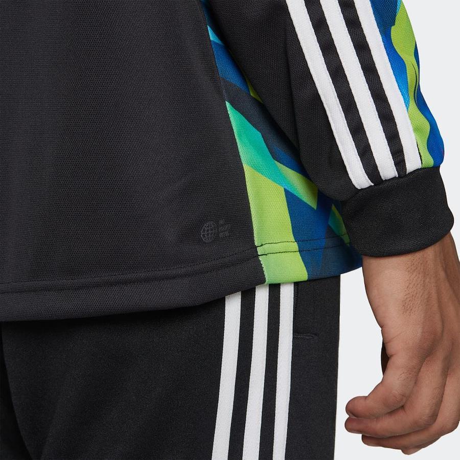 【DETAIL】・リサイクル素材で作られた、ゆったりめのカラフルジャージー。・大胆であればあるほど良い。・アディダスのジャージーにおいては特に、それが一番大事なこと。・ゴールキーパーのユニフォームの力強さにインスピレーションを得た、鮮やかなカラーをフロントにあしらった万華鏡を思わせるデザイン。・素材には、滑らかでクラシックなトリコットを採用。・バージン素材の生産による環境への悪影響を防ぐため、裁断スクラップや家庭内廃棄物などの製造廃棄物から生まれたリサイクル素材を使用している。