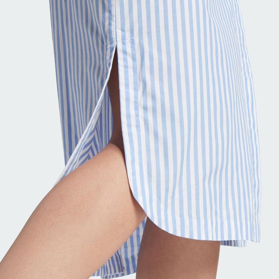 【DETAIL】・シンプルかつ洗練された雰囲気の、ストライプ柄ワンピース。・スマートさとカジュアルエレガンスを融合させ、着こなしやすいデザインに仕上げた、軽やかなシャツワンピース。・ソフトなコットン素材を使い、暖かい日中からちょっと肌寒くなる夜まで活躍できるように、あえてルーズなシルエットに仕立てている。・爽やかに映るシャツ襟とカフが、トラディショナルなルックスを洗練された雰囲気に格上げ。・カーブをつけた裾にサイドスリットをわずかに入れ、実用性とビジュアル的魅力を両立させている。・一枚でさらっと着ても、ベルトでウエストマークしてもいい、動きやすさも魅力の一枚。・サステナブルな綿花栽培をサポートしている、アディダスのコットン製品。