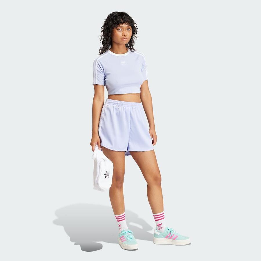 (アディダスオリジナルス) adidas Originals スリーストライプス 半袖ベビーTシャツ 半袖Tシャツ レディース スリーストライプス 半袖ベビーTシャツ 半袖Tシャツ レディース KNZ20 IT0658 WOMEN THREE STRIPES SHORT SLEEVE BABY T-SHIRT VIOLET TONE