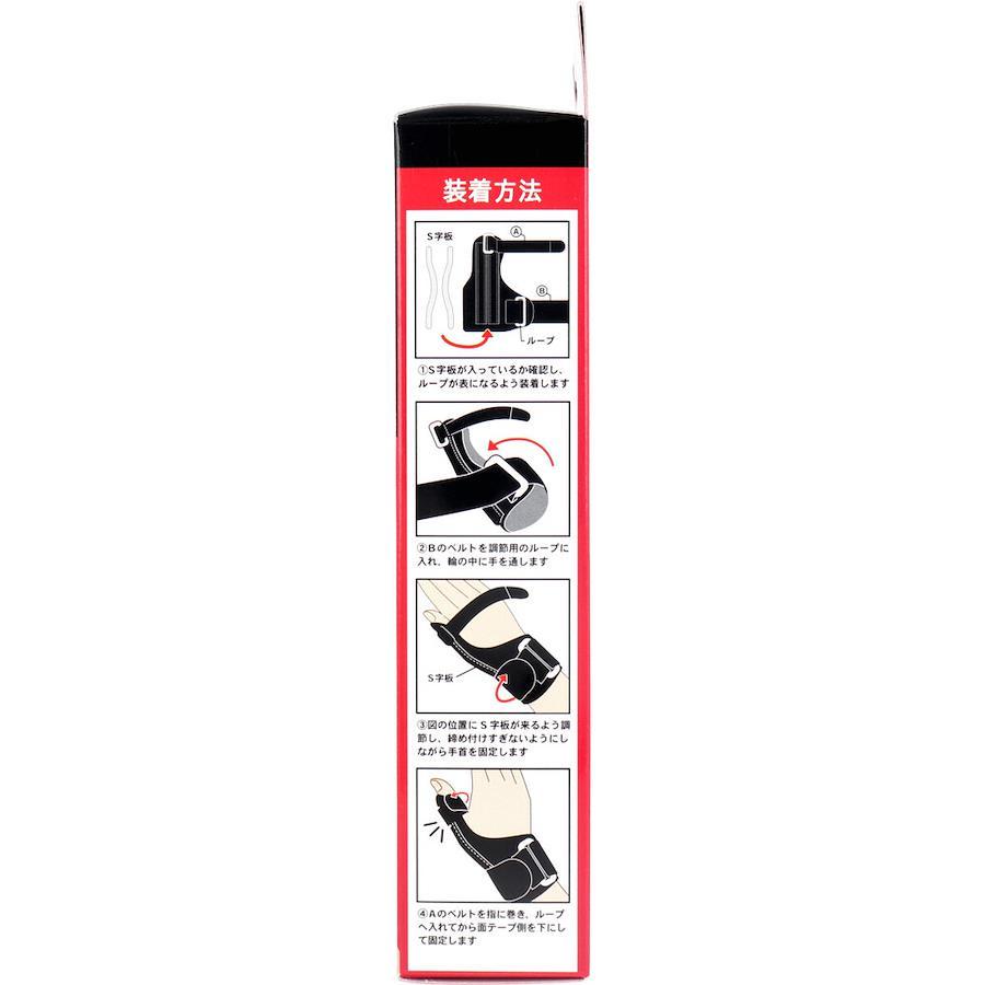 【装着方法】(1)S字板が入っているか確認し、ループが表になるよう装着します。(2)ベルトを調節用のループに入れ、輪の中に手を通します。(3)S字板の位置を調節し、締め付けすぎないようにしながら手首を固定します。(4)ベルトを指に巻き、ループへ入れてから面テープ側を下にして固定します。