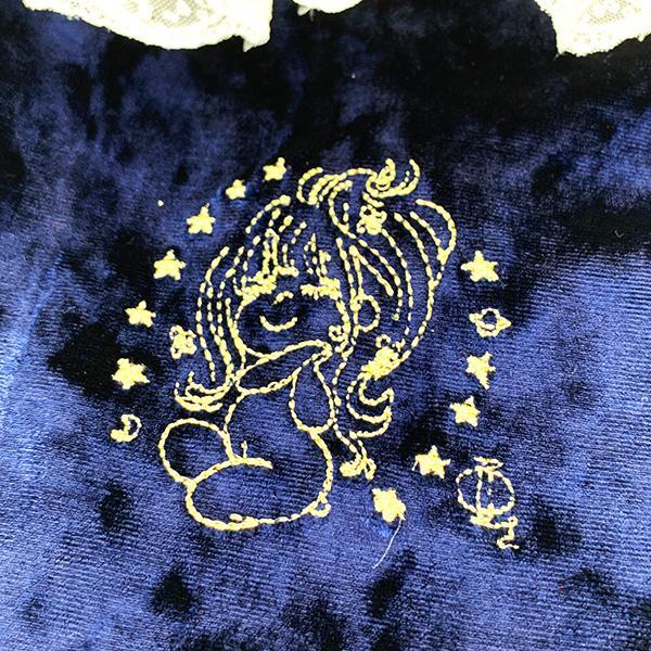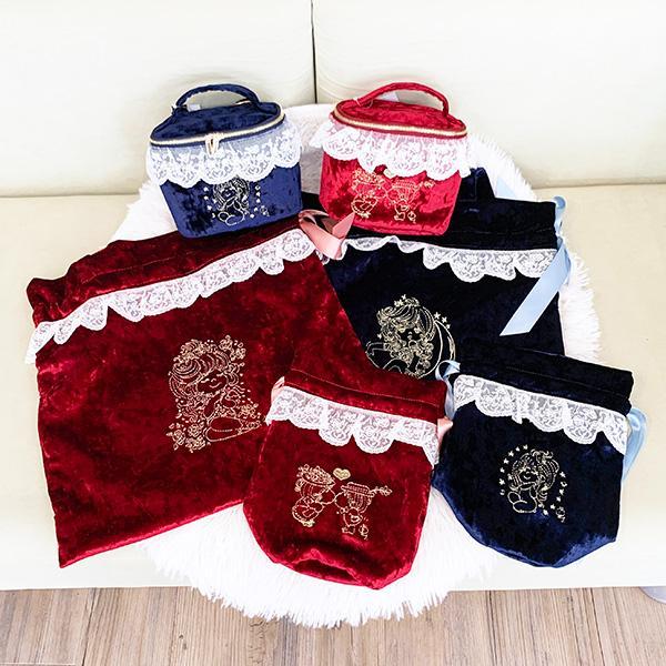高級感のあるベロア生地に金刺繍のあしらいがゴージャスなシリーズが登場しました♪水森亜土さんのイラストをデザインしたオリジナルレースがポイント☆彡 底が円型なのでたくさん入るのもうれしいですね♪