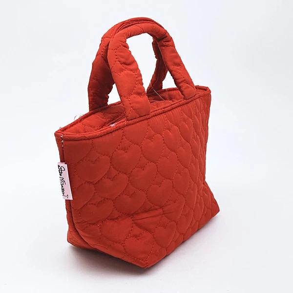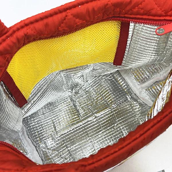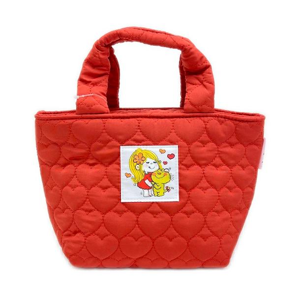 水森亜土のキルティング生地のランチバッグです。内側は保温・保冷効果のあるアルミ蒸着素材!保冷剤などを入れられるメッシュポケット付きが嬉しいポイント♪ハートキルティングがとっても可愛いのでランチバッグとしてはもちろん、ちょっとしたおでかけで持っても可愛いです☆彡