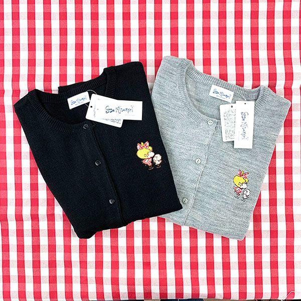 胸に亜土ちゃんのキュートなイラストが刺繍されたニットカーディガンです。アクリル100%で肌触りもふわっふわ☆とっても柔らかく女性らしい上品な仕上がりになっています♪[サイズ]M 着丈:約58 cm 身幅:約44.5 cm 肩幅:約35.5 cm 袖丈:約60 cm