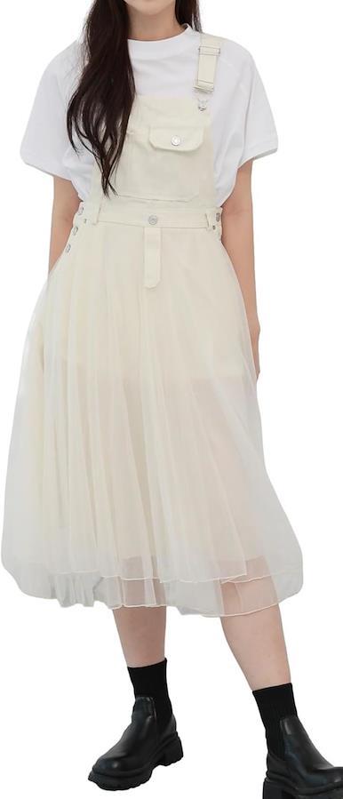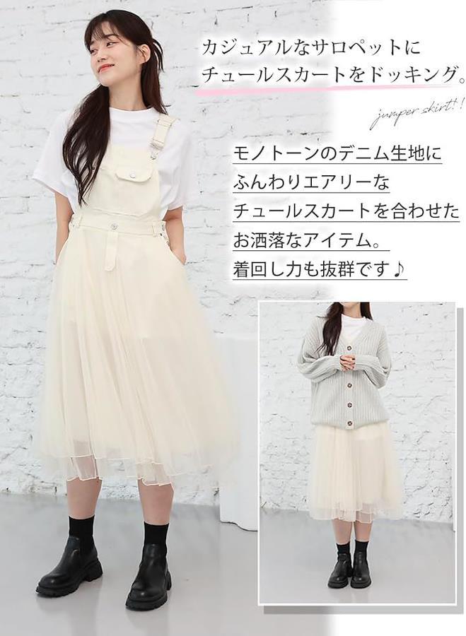 デニム素材のジャンパースカートにふんわりと揺れるチュールをドッキングしたアイテム。