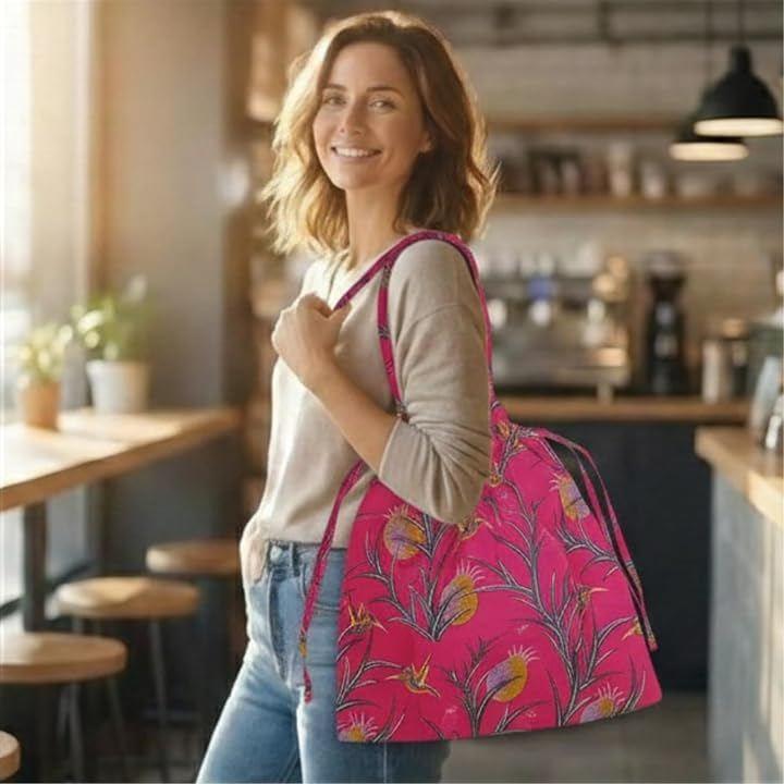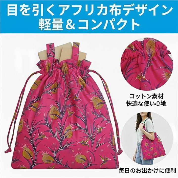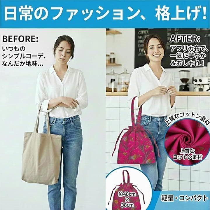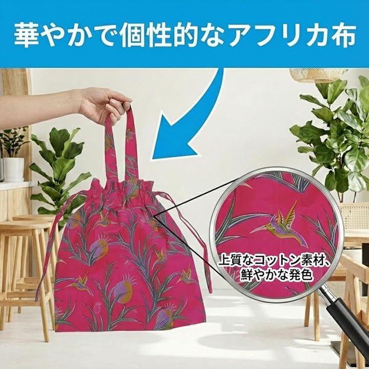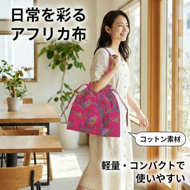 「素材」コットン 「サイズ」縦約40cm、横約38cm、マチなし、持ち手長さ約50cm 「目を引くアフリカ布デザイン」 日常のコーディネートに華やかさを加えるアフリカンプリントの巾着トートバッグです。