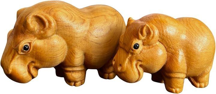 African Hippopotamus Family Figurine, Wooden Miniature Animal Ornament, Perfect as a Gift for a Newborn, Shelf, Desk, Entryway, or as a Welcome Charm or Amulet