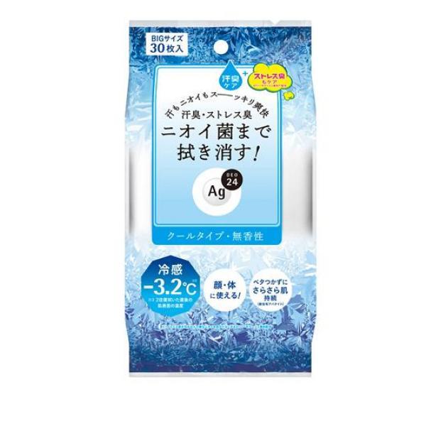 製品の特徴●Ag DEO24 エージーデオ24 クリアシャワーシート n クール(無香性)●顔・体に使える!フェイス・ボディ用。●汗もニオイもスーッキリ爽快。●汗臭・ストレス臭・ベタつき・汚れ・ニオイ菌まで拭き消す!●拭いた瞬間ひんやり気持ちいい。●肌表面の温度-3.2℃(※1)クール感持続●持続型クールエッセンス配合。●白くならずさらさら肌続く。●銀含有アパタイト(さらさらパウダー)・ヒアルロン酸パウダー(保湿)配合ストレス臭を包み込んで嫌なニオイを目立たなくするSTハーモナージュ香料配合。●全身これ1枚大判サイズ(250mm×200mm)●販売名:エージー24 クリアシャワーシート n(クール)[※1:2往復拭いた直後の肌表面温度]