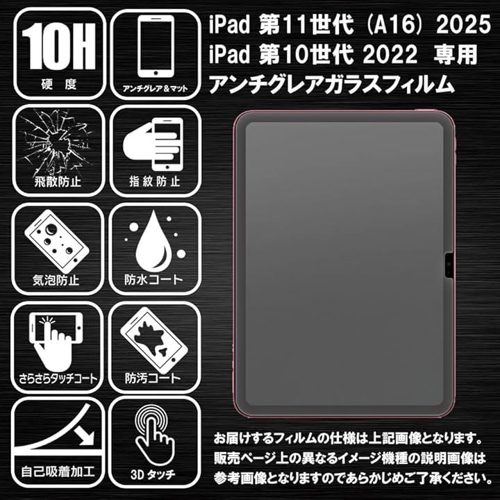 「対応機種」iPad 第11世代 (A16) 2025 用/第10世代 2022 用「仕様」*本製品は国産AGC旭硝子素材を使用して中国の委託工場にて生産及び加工を行っております、 クリアタイプ 非光沢 アンチグレア マット仕上げ 表面硬度10H 薄さ0.33mm 指紋防止 防汚コート 飛散防止処理 自動吸着 3Dタッチ感度対応。