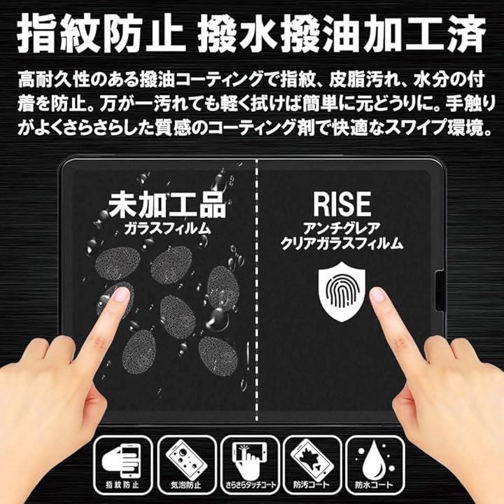 「撥水撥油」アンチグレア加工により指紋を軽減、皮脂や水滴をはじきます、万が一汚れてもさっと拭き取るだけで元どうりに。