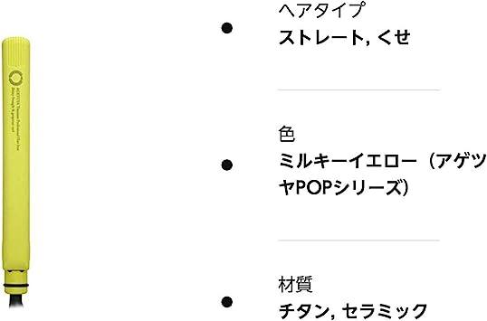 通常1-5営業日で発送:ブランド AGETUYA(アゲツヤ)ヘアタイプ 全髪質材質 セラミック, チタン色 ミルキーイエロー(アゲツヤPOPシリーズ)商品の重量 450 グラム電源 電源コード式最大温度設定 220 度ヒーター表面の素材 セラミック商品の寸法 26L x 3W cm