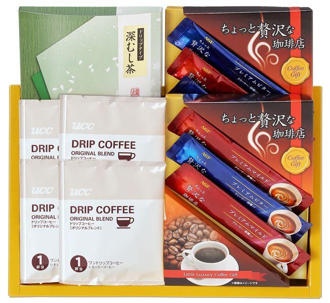 甘い香りが特徴のまろやかな味わいのAGFコーヒープレミアムマイルド、しっかりとした苦みとコク深い味わいが特徴のAGFコーヒープレミアムビター。コクのある苦味とまろやかな味わいのUCCドリップコーヒー。本格的なお茶を急須無しでお楽しみいただけるドリップタイプの深むし茶の詰め合わせです。