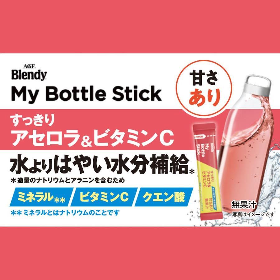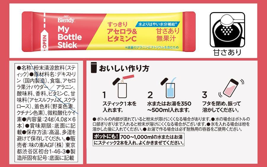 「Blendy(ブレンディ)」 マイボトルスティックは、水またはお湯にスティックを1本入れて振るだけで1日を楽しめるマイボトルサイズのパウダードリンクです。スティック1本で350ml~500mlのマイボトル1本分。「プラスチック使用減の環境性」「ペットボトル・缶飲料よりも経済的」「高い水溶性パウダーですぐできる時短」を実現し、エコ&スマートライフを応援します。AGF(エージーエフ) 「ブレンディ」 マイボトルスティック すっきりアセロラ&ビタミンC 6本は、マイボトルに最適なレシピで水とまぜればすぐできる、パウダータイプのアセロラドリンクです。心地よい甘酸っぱさで晴れやかに気分をリフレッシュ。アミノ酸の一種であるアラニンとナトリウムを配合することで水よりはやい水分補給を応援します。塩分・ビタミンC・クエン酸入り。1回1回がいつも便利な個包装スティックタイプ。冷たい水にも"秒溶け"なので、手軽でゴミも少ない粉末スティックです。普段お使いのボトルやマグボトル(ステンレス除く)、ケータイマグ、タンブラーなどの水筒に入れてお持ち運びください。熱中症対策(1本で350ml~500ml)にもおすすめです。※ホットの場合は、耐熱性のあるボトルをご使用ください。