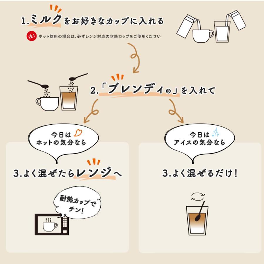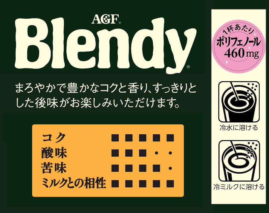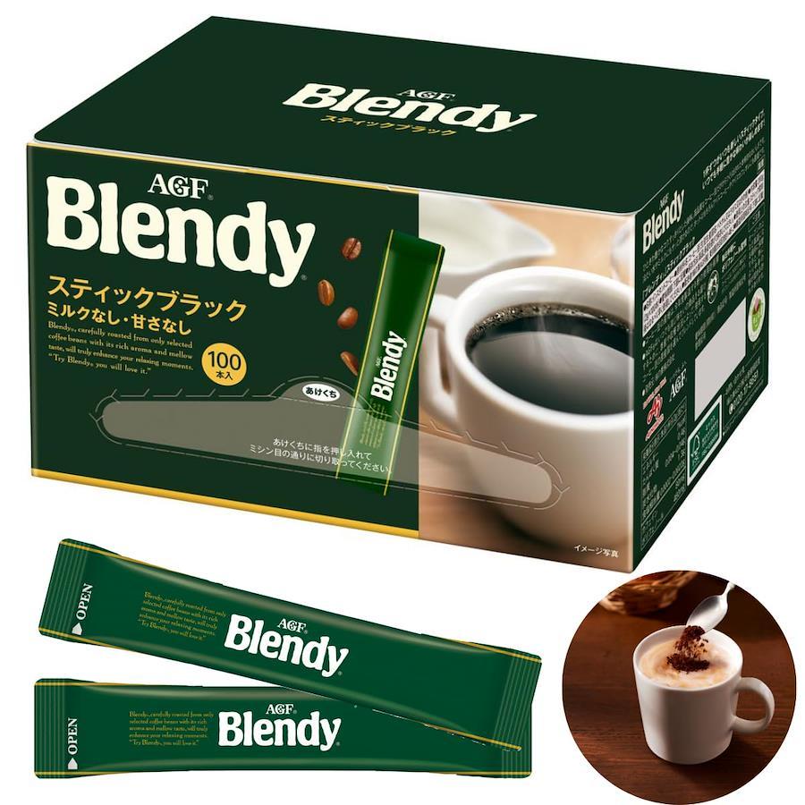 「カフェオレは、得意なんです。ブレンディ。」でおなじみの「Blendy(ブレンディ)」 インスタント・コーヒーは、独自の焙煎技術により、まろやかで豊かなコクと香りが楽しめます。スプレードライ製法にひと手間加えた独自のアグロマート製法の粉末なので、冷たい水や牛乳(ミルク)にも簡単に溶け、ホットはもちろん、アイスコーヒーやアイスカフェオレにも最適です。AGF(エージーエフ) 「ブレンディ」 スティック100本は、まろやかで豊かなコクと香り。冷たい水や牛乳にもおいしく溶ける、「ブレンディ」パーソナルタイプのお得な大容量サイズです。1杯1杯がいつも新鮮な個包装スティックコーヒー(ブラック、ミルクなし、甘さなし)です。冷たい水や牛乳にもサッと溶けるので、簡単にアイスコーヒーやアイスカフェオレが楽しめるインスタントコーヒーです。ブラックコーヒーではもちろんお好みでスティックシュガーやスティックコーヒーミルクと一緒にオフィスやご家庭でお楽しみください。コーヒー豆の焙煎から充填まで全て国内の工場で生産し、繊細な日本人の味覚に合わせて開発したインスタントスティックコーヒーです。100杯分なので、オフィスやご自宅でたくさん消費される方に最適なインスタントコーヒーです。