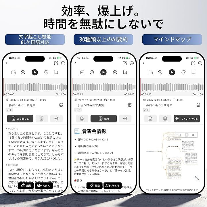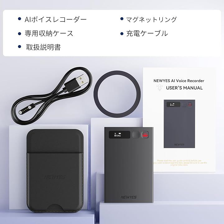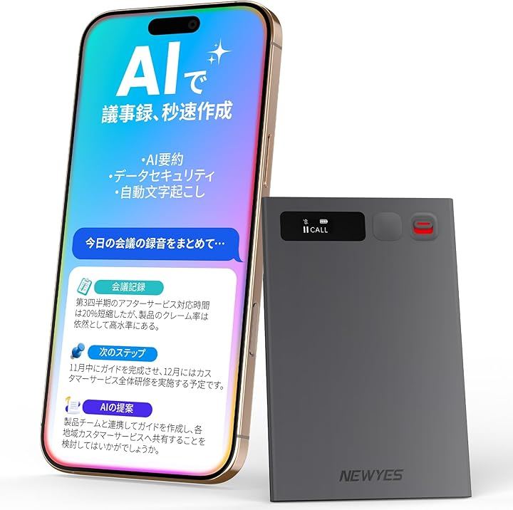「高精度AI文字起こし&AI要約」NEWYES AI ボイスレコーダー 搭載。高精度な音声認識で、会議やインタビューの内容を瞬時にテキスト化します。