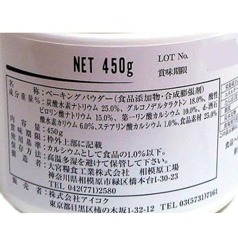 ■成分重量%:炭酸水素ナトリウム 25.0%、グルコノデルタラクトン 18.0%、酸性ピロリン酸ナトリウム 15.0%、第一リン酸カルシウム 10.0%、d‐酒石酸水素カリウム 6.0%、ステアリン酸カルシウム 1.0%、食品素材 25.0%