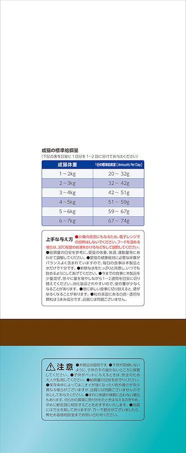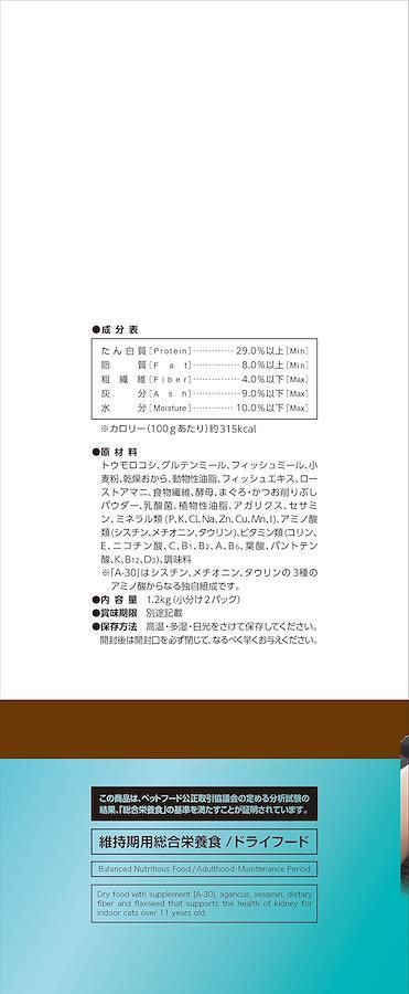 【原材料】 トウモロコシ、グルテンミール、フィッシュミール、小麦粉、乾燥おから、動物性油脂、フィッシュエキス、ローストアマニ、食物繊維、酵母、まぐろ・かつお削りぶしパウダー、乳酸菌、植物性油脂、アガリクス、セサミン、ミネラル類(P、K、Cl、Na、Zn、Cu、Mn、I)、アミノ酸類(シスチン、メチオニン、タウリン)、ビタミン類(コリン、E、ニコチン酸、C、B1、B2、A、B6、葉酸、パントテン酸、K、B12、D3)、調味料 【保証成分】 たん白質・・・29.0%以上、脂質・・・7.5%以上、粗繊維・・・4.0%以上、灰分・・・9.0%以下、水分・・・10.0%以下 【エネルギー】 310kcal(100gあたり)