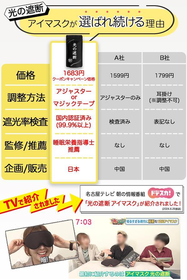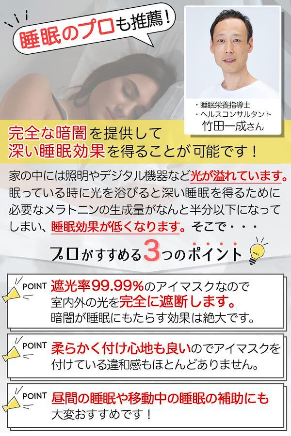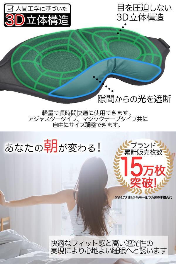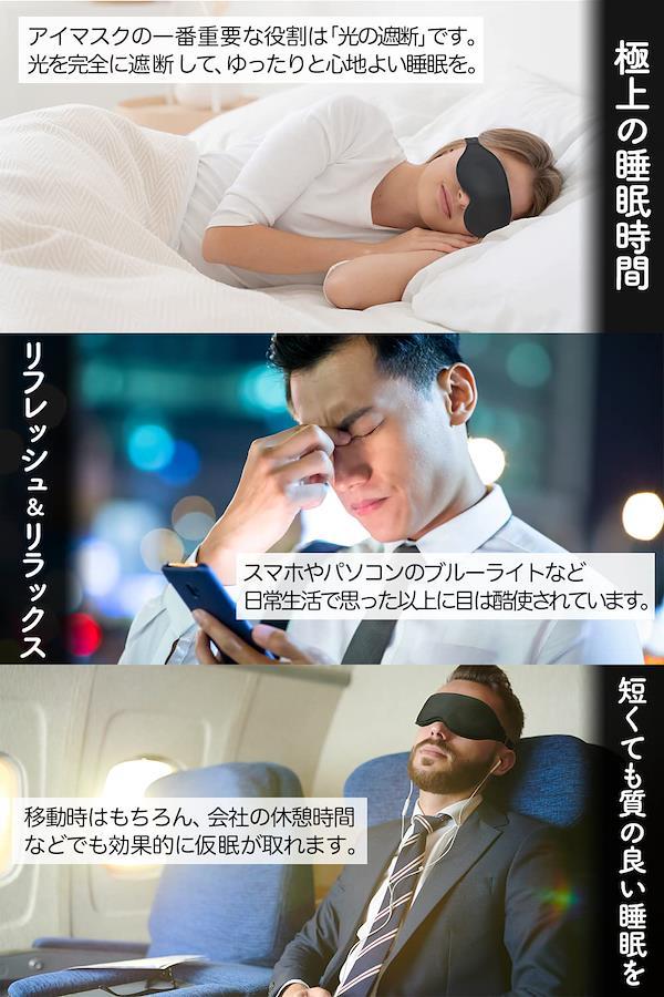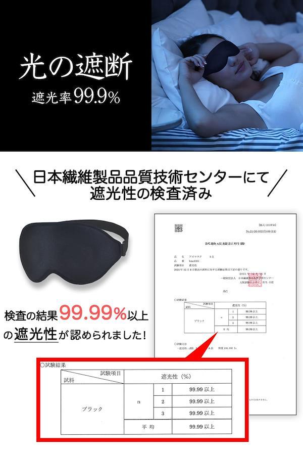 【国内認証済み 遮光率99.99%】 アイマスクの一番重要な役割は「光の遮断」です。 現代では充電中の小さい光や待機電源など暗い部屋では目立ってしまうため、電気を消すだけで真っ暗の環境を得る事は難しく また電気を消しても少し時間が経つと目が慣れてきて光を感じてしまいます。アイマスクを選ぶ際は遮光率を意識することが重要です。 【人間工学に基づく立体構造、着け心地】 3D立体構造になっており目元の圧迫が少なく、しかも軽量で快適に利用できます。 「短時間の仮眠で体力を回復させたい」という社会人や旅行者にとって、アイマスクは必需品と言える安眠グッズです。耳掛けタイプではなくヘッドバンドタイプを採用しておりますので、アジャスタータイプ、マジックテープタイプ共に自分にあった締め付け具合を自由に調整できます。 【長く快適に使用できるための厳選素材】 夜寝るときに使う場合は長時間着用することになるので、遮光性だけでなく通気性の高いモノを選ぶのがおすすめです。 手洗いできるウォッシャブル素材なので、定期的なお手入れで春夏秋冬一年中通して清潔に使えます。 【目の癒し、休息】 最近は在宅ワークやおうち時間の増加により、スマホやパソコンの使用率増加に伴い目の疲れを感じる人が増えています。 アイマスクを付けると光が遮断されるので、ちょっとした休憩時間でもしっかり休息でき、目を休ませることができます。 【移動中や隙間時間にリフレッシュ】 持ち運べる便利な収納袋つきなので、どこでも気軽にゆったり休息を・・・ オフィスで仮眠を取りたい時や、少し昼寝がしたい・・・と思った時に役立つ、便利グッズ 多忙な現代人にとって、「短くても質のよい睡眠をとること」はとても重要です。是非アイマスクを取り入れてみませんか? 【製品サイズ】10.5×23.5×1.5㎝