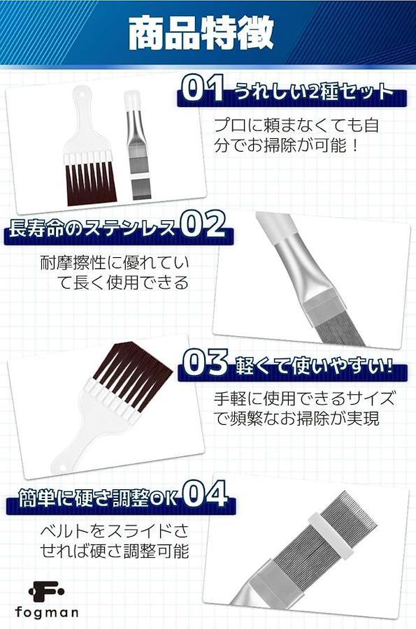 「商品特徴」(1)うれしい2種セット:プロに頼まなくても自分でお掃除が可能。/(2)長寿命のステンレス:耐摩擦性に優れていて長く使用できる/(3)軽くて使いやすい.:手軽に使用できるサイズで頻繁なお掃除が実現/(4)簡単に硬さ調整OK:ベルトをスライドさせれば硬さ調整可能
