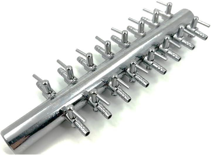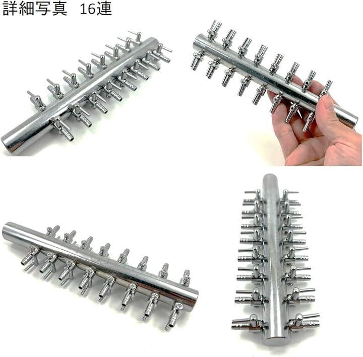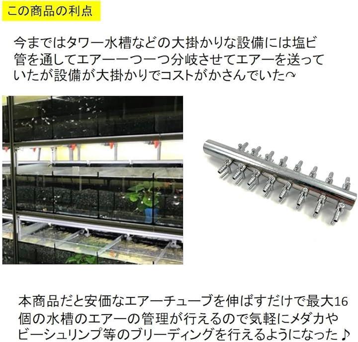 「この商品の利点」今まではタワー水槽などの大掛かりな設備には塩ビ管を通してエアー一つ一つ分岐させてエアーを送っていたが設備が大掛かりでコストがかさんでいた↷本商品だと安価なエアーチューブを伸ばすだけで4個、8個、 12個、 16個 の水槽のエアーの管理が行えるので気軽にメダカやビーシュリンプ等のブリーディングを行えるようになった。