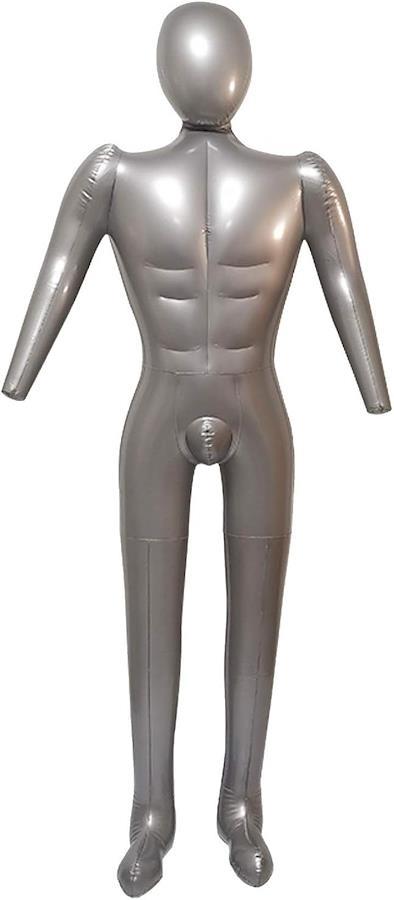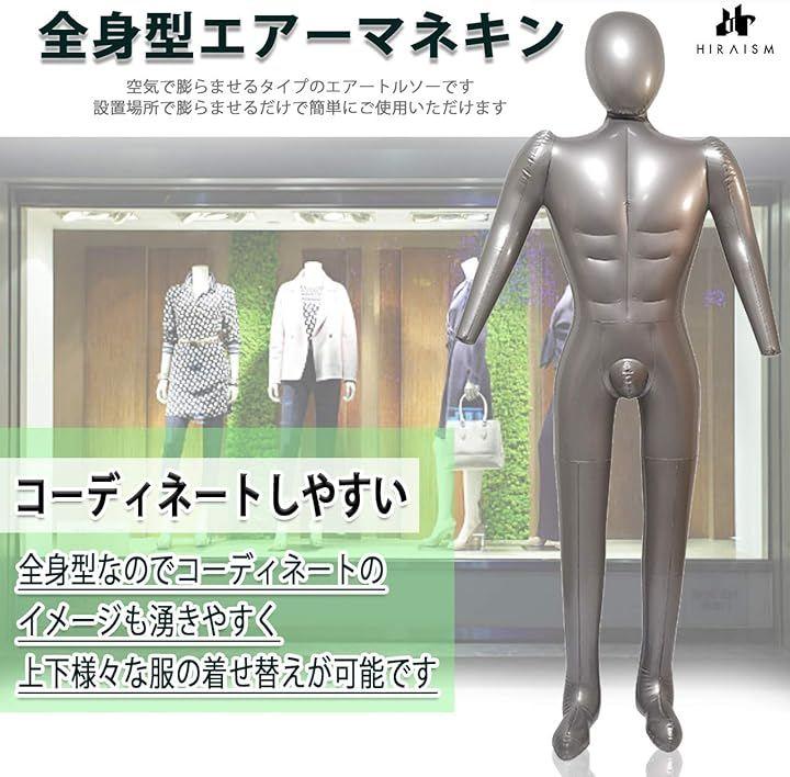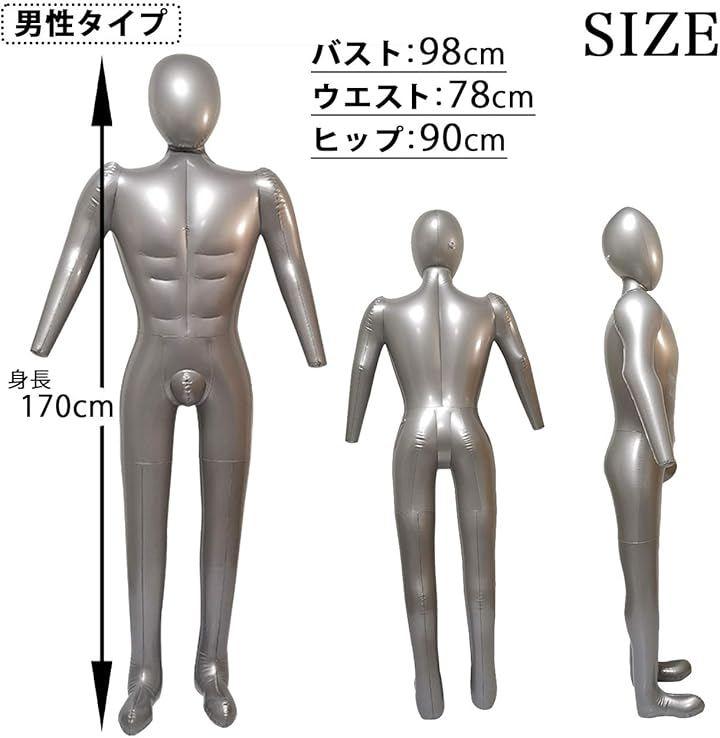 「商品内容」エアーマネキン 全身タイプ:1個 性別:男性 仕様:エアー式 サイズ:身長170cm、バスト98cm、ウエスト78cm、ヒップ90cm 重量:400g 素材:PVC カラー:シルバー