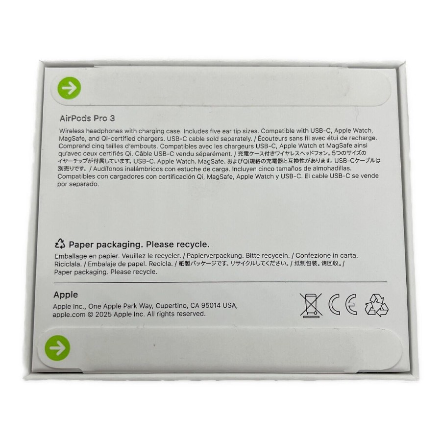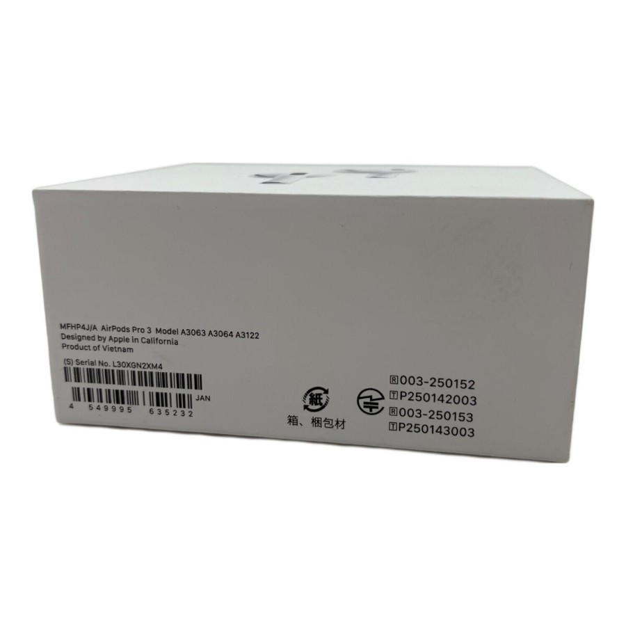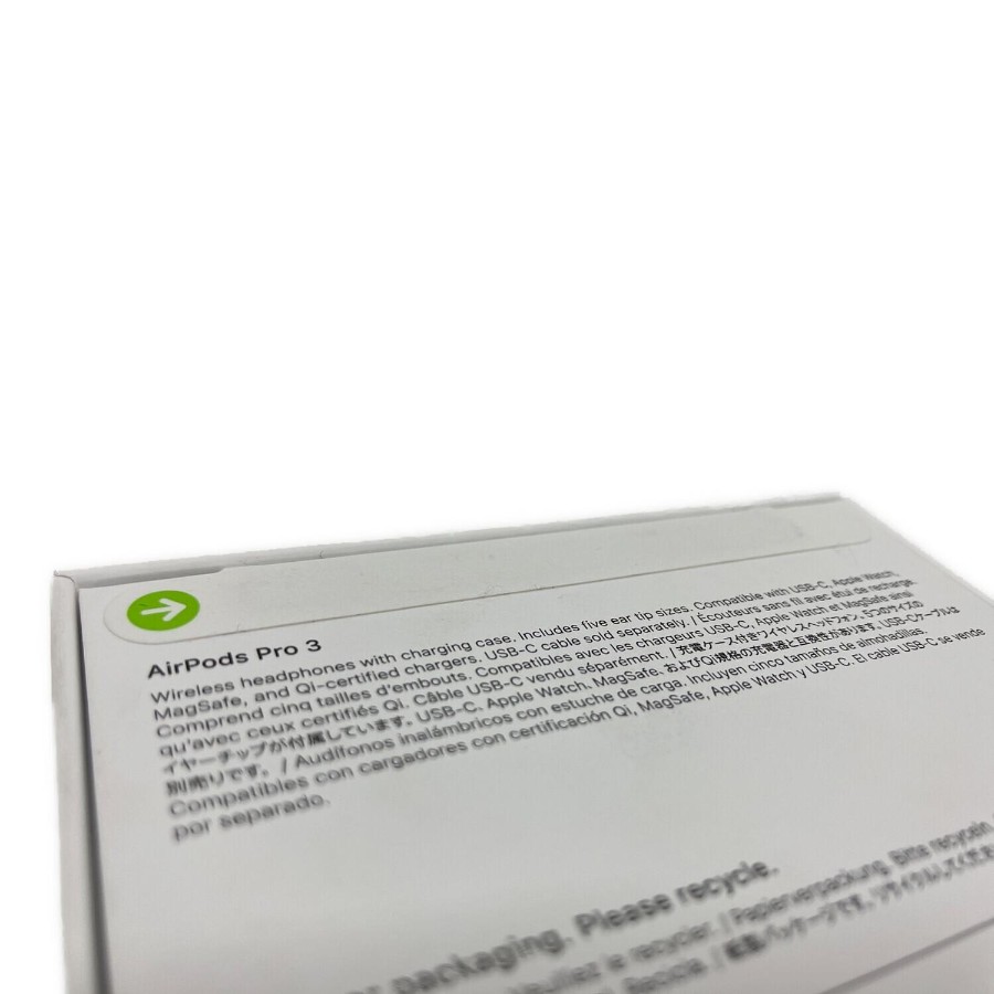 こちらの商品は未使用となりますが、検品および撮影のため、外箱や袋を開封することがあります。また、店頭にて展示販売を行っているため記載に無い細かなキズ、ヨゴレが見受けられる場合がございます。■商品説明ブランド :Appleアイテム名:AirPods Pro(第3世代)型番 :MFHP4J/Aタイプ:カナル型接続タイプ:完全ワイヤレス(左右分離型)本体操作スイッチ:タッチセンサー充電端子:充電ケーブル/USB Type-C/Qi(ワイヤレス充電器別売)ワイヤレス:Bluetooth(バージョンVer.5.3)連続再生時間:最大8時間(ANC有効)/最大10時間(外部音取り込みモードでヒアリング補助機能使用時)ノイズキャンセリング:○マイク:○外音取り込み:○防水・防塵性能:IP57リモコン:○AIアシスタント呼び出し機能:○重量:5.55 g■付属品箱付(未開封)■その他必ず、商品注文される前に店舗情報に記載している注意事項をご確認ください。