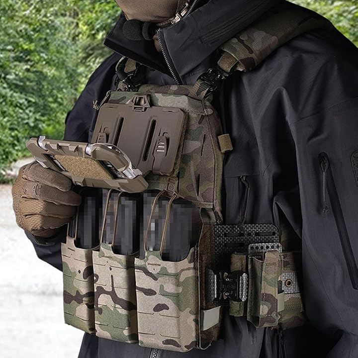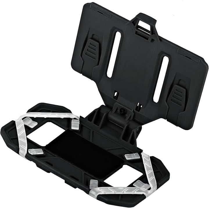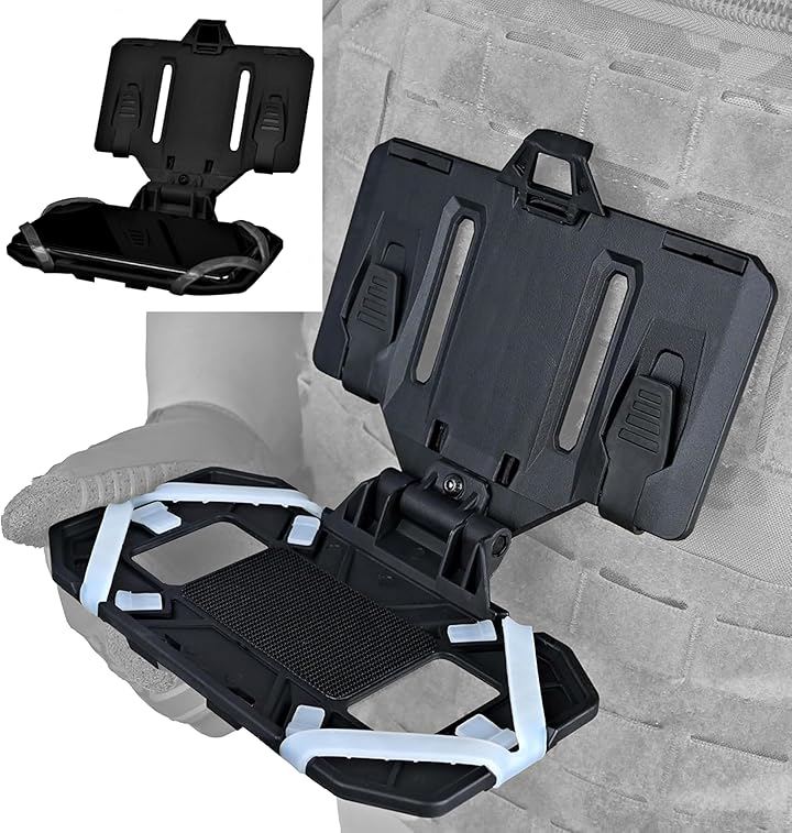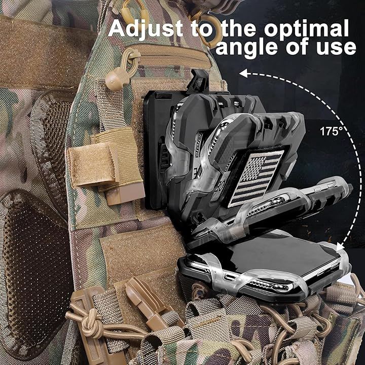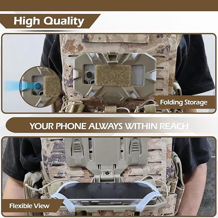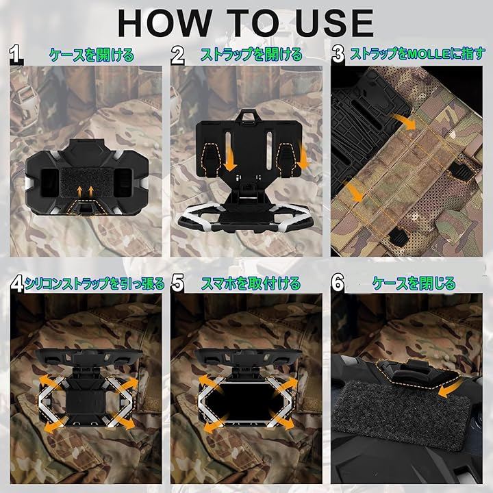 「特徴」〇molleシステム対応でタクティカルベストやバックパック等に取付けできます〇サバイバルゲーム中でも簡単にスマホ画面を見ることができます〇スマホカメラレンズに干渉しないデザインのためプレイ中の臨場感あふれる画像や動画配信が撮影可能です〇スナップボタンで簡単に開閉ができ、角度も最大175°まで開くことができ、様々な態勢、シチュエーションに対応可