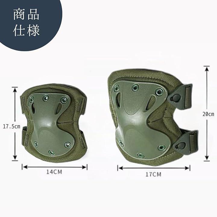 「商品内容」肘用あてサイズ:約14cm x 約17.5cm 膝あてサイズ:約17cm x 約20cm カラー:ブラック/グリーン