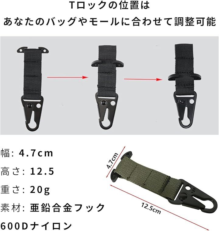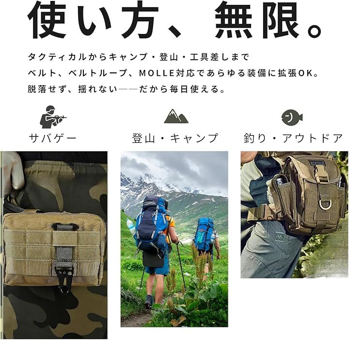 サバゲーやアウトドアギアとの相性も抜群で、ベルトフックとしてだけでなく、タクティカルな装備オーガナイザーとしても活躍します。
