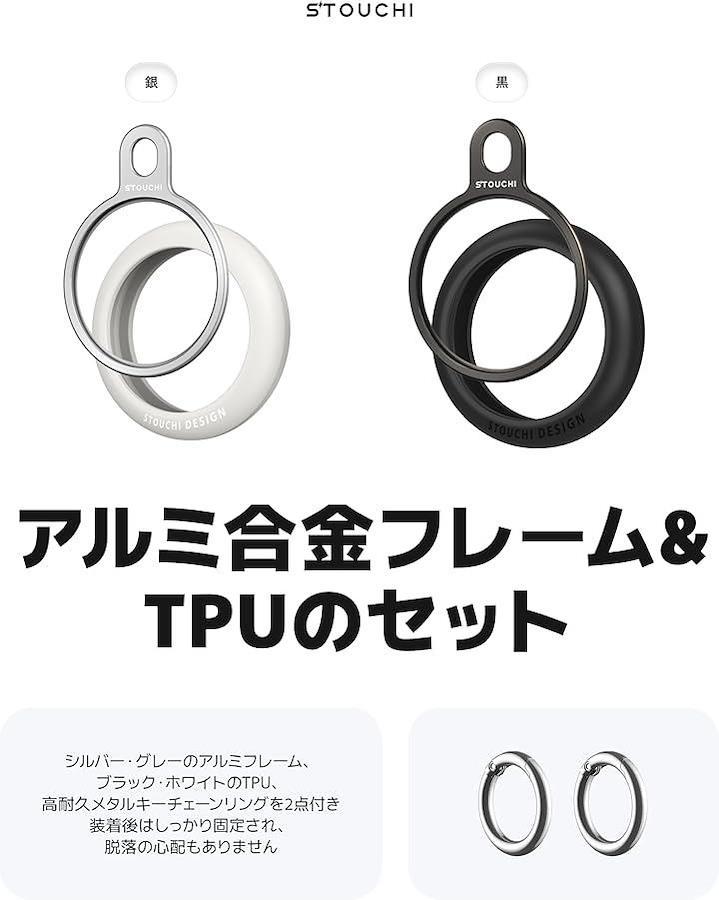 「航空アルミ+TPUの二重保護構造・AirTagをしっかり守る」航空アルミ合金の堅牢フレームに、衝撃を吸収する柔軟TPUを組み合わせたStouchi独自設計。