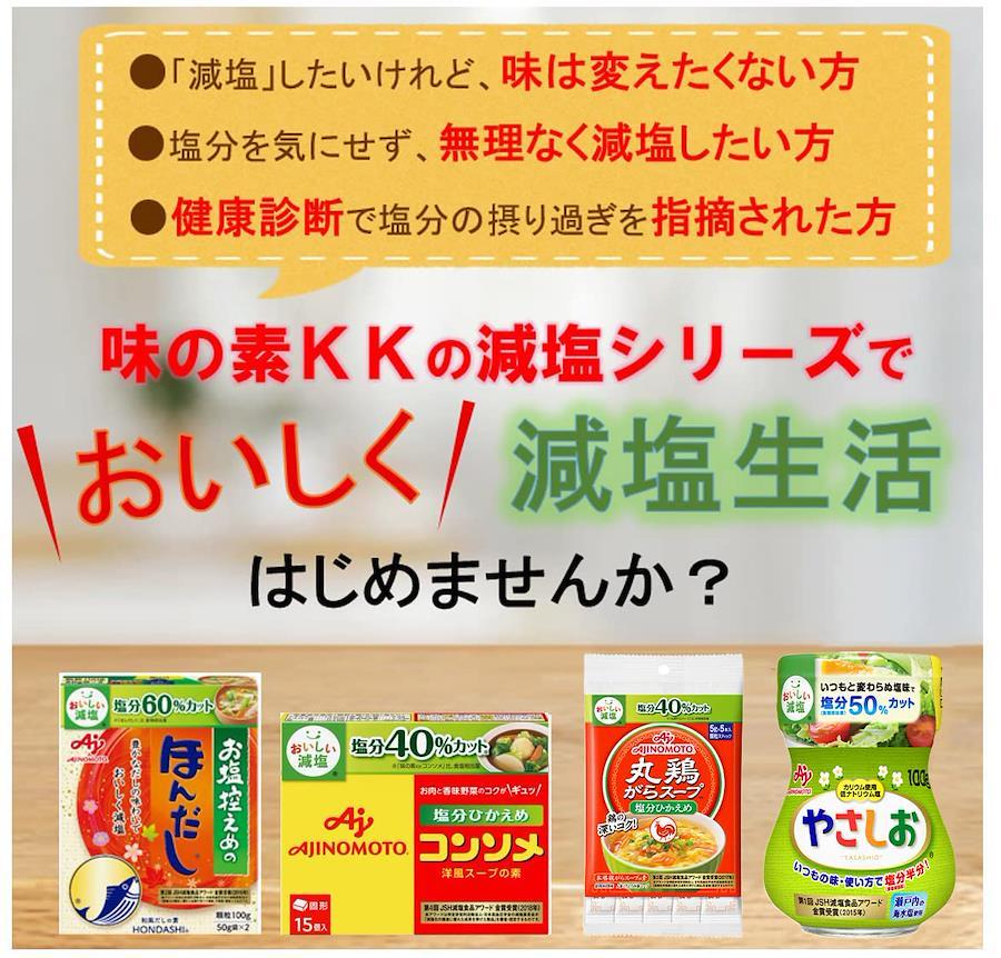 「お塩控えめの・ほんだし?」、「味の素KK コンソメ」〈塩分ひかえめ〉、「丸鶏がらスープ」〈塩分ひかえめ〉といった減塩調味料を発売しています。使用上の注意