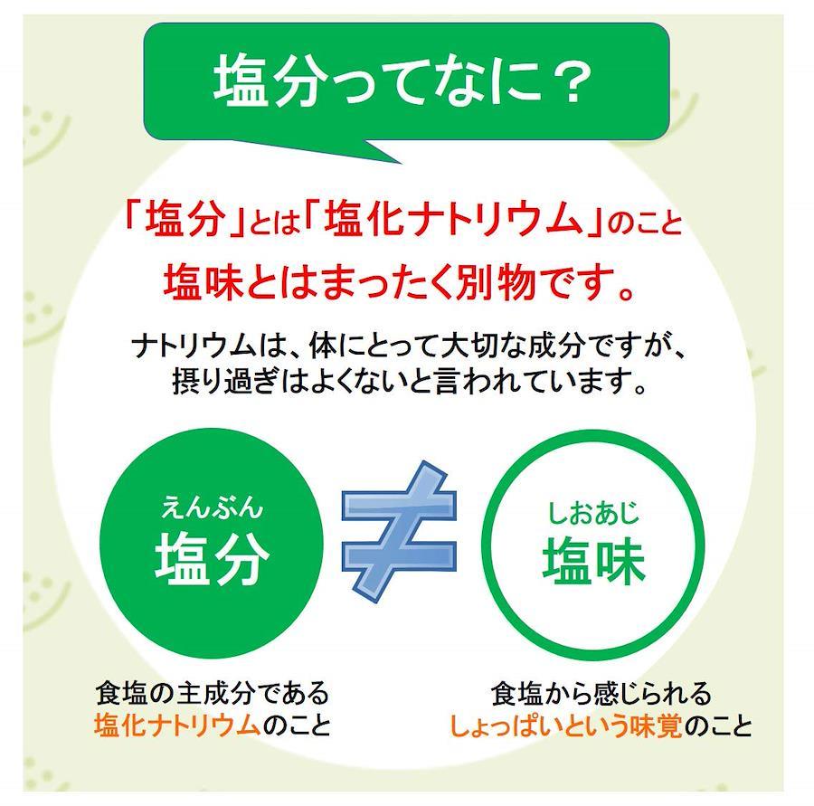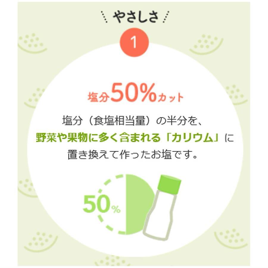 瀬戸内地方・備前岡山産の海水塩に、塩分(食塩相当量)の半分を野菜や果物に含まれる「カリウム」に置き換えることで、塩分50%カットを実現。毎日のお料理を手軽にお塩控えめにすることで、おいしい減塩生活をサポートします。※市販の食塩*に比べて食塩相当量を50%低減(*日本食品標準成分表2015より)